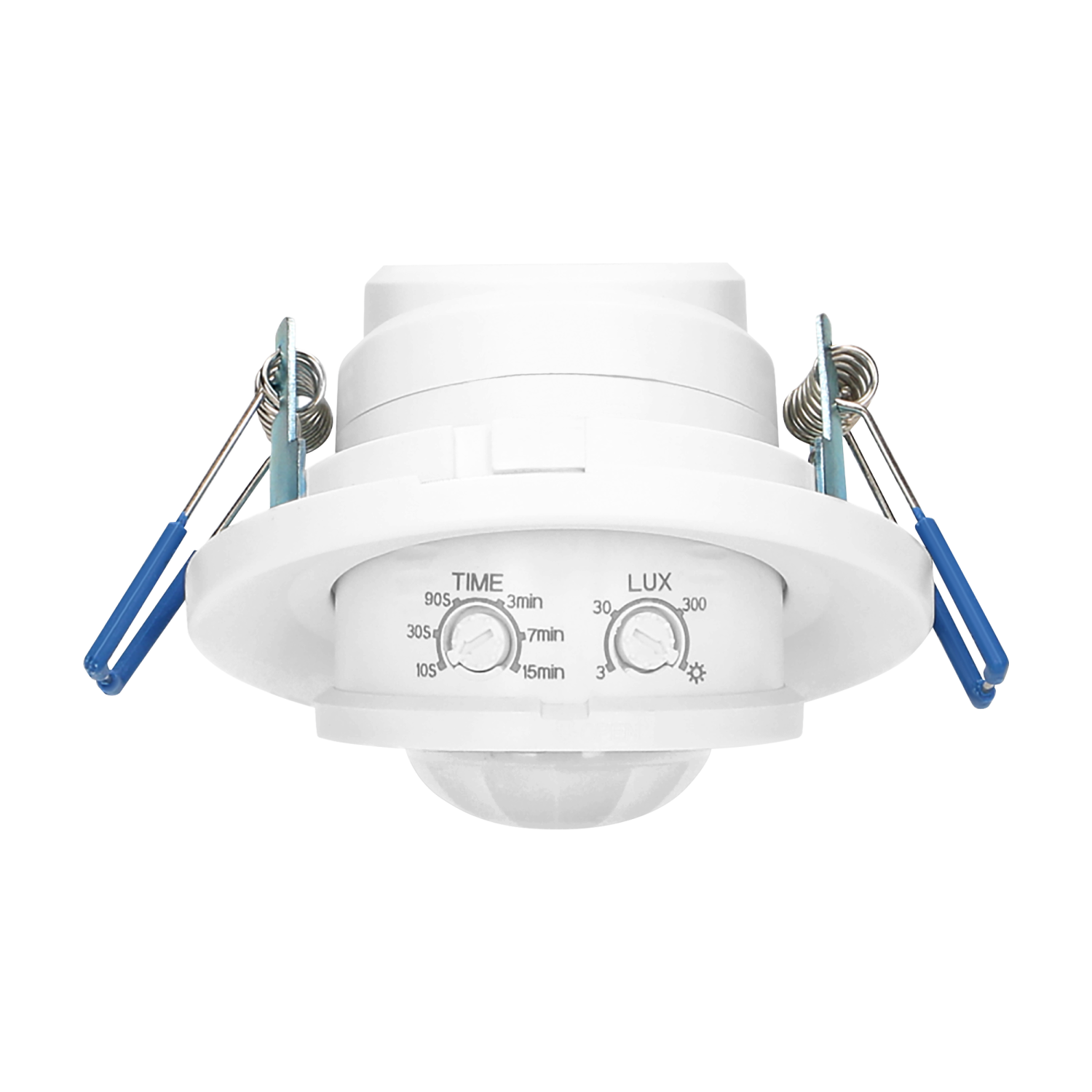 Passive infrared sensor For indoor usage Collaborates with LED lighting Regulation: lighting time (TIME) and the sensitivity of the light intensity (LUX) Installation in suspended ceilings.
