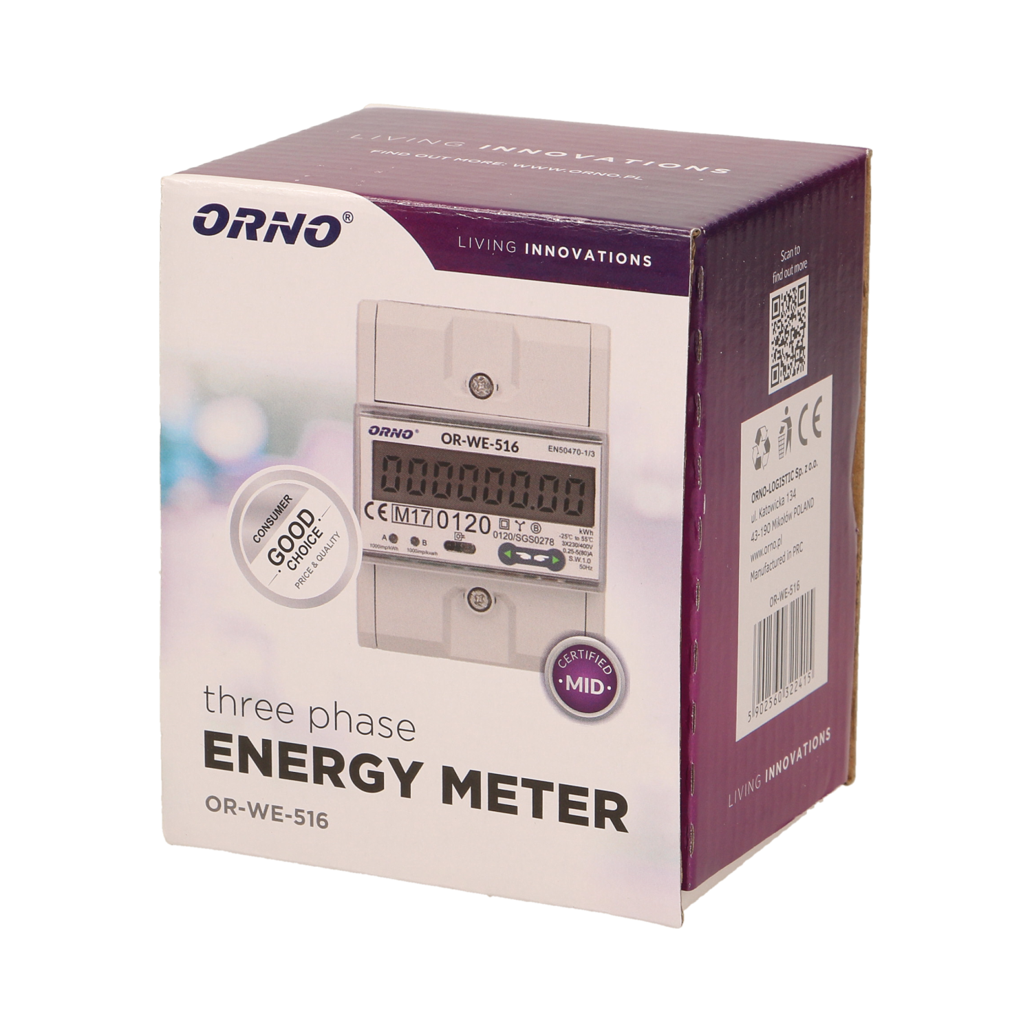 Device for making indications in kWh with the possibility of remote reading registers of indicators, via a wired network of RS-485 standard. A special electronic circuit, by the flow of current and applied voltage generates pulses in proportion to the energy consumed. Phase energy consumption is signaled by a flashing LED. The number of pulses is converted into energy input and its value is indicated on the LCD display (6 + 2). MID Certificate 0120/SGS0278.
