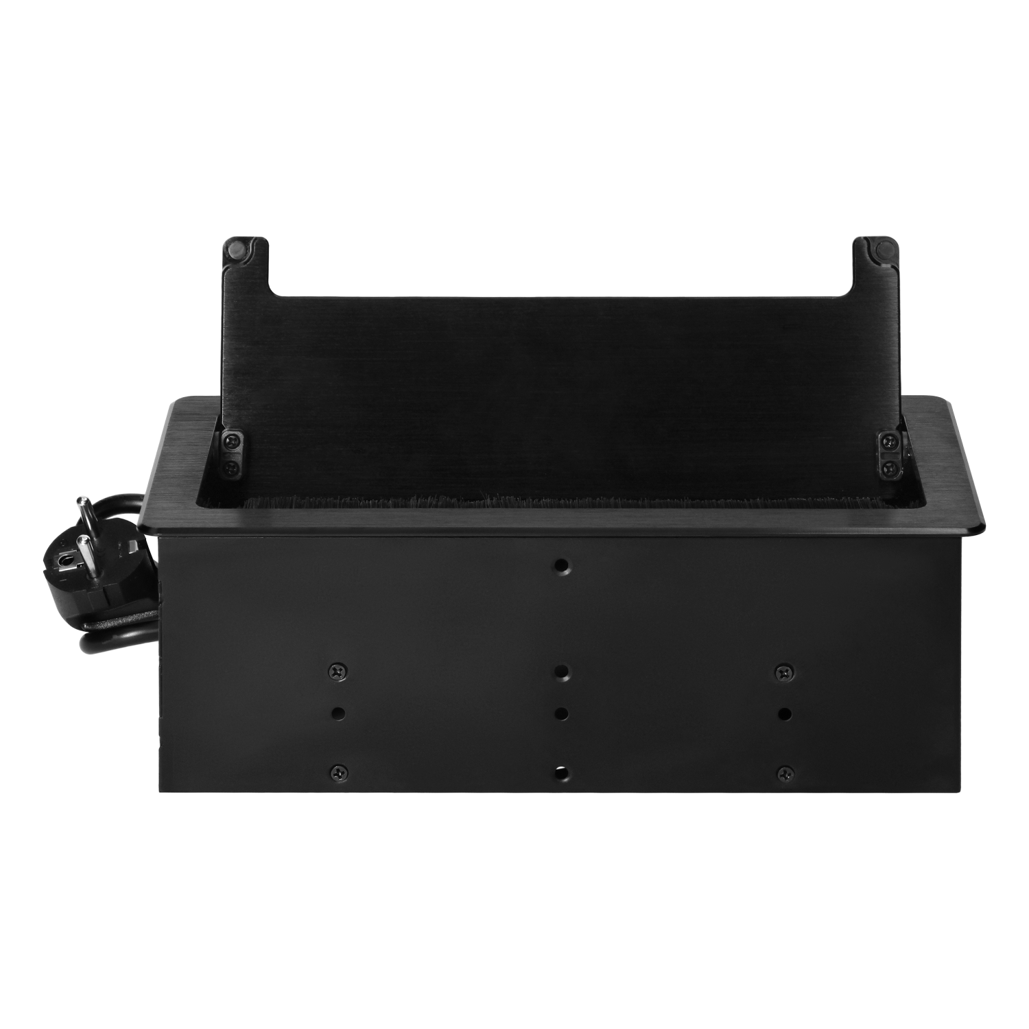 The socket is black, rectangular in shape (130x265 mm). The thickness of the milled edge is only 2mm, which gives the effect of subtlety and a discreet finish. The socket is perfect for indoor dry rooms, such as offices, study rooms, conference rooms or living rooms.