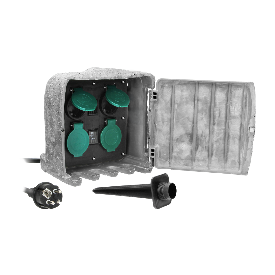 Garden sockets (4x2P+E schuko) in a plastic stone-like case. This solution guarantees that the sockets are well protected against weather conditions and that they integrate well with the surrounding garden landscape. These garden sockets come together with a rubber cable 3m long. Users can select from 2 available working modes - manual (max.3680W) and with the use of a twilight sensor (max.1100W).