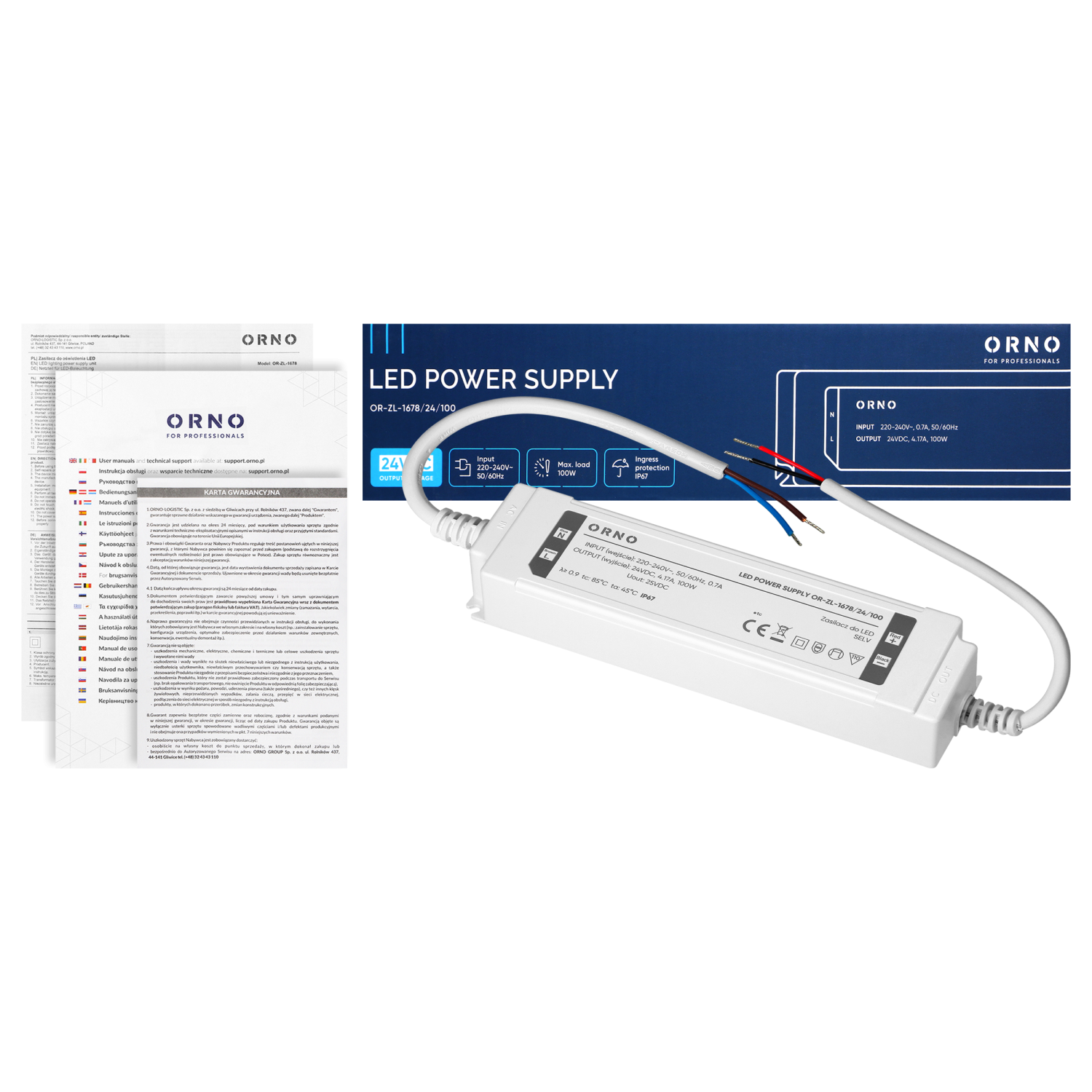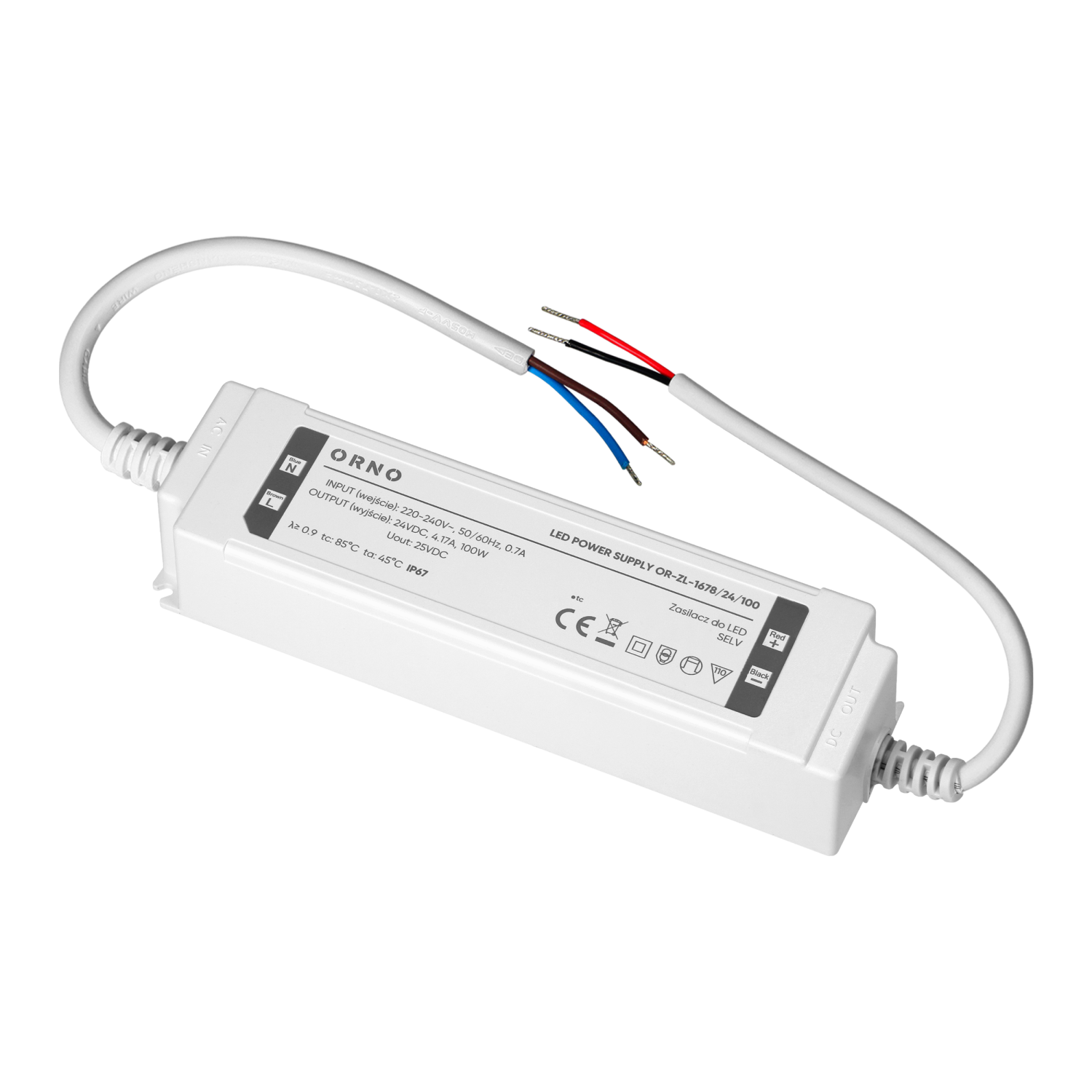 The unit operates within an input voltage range of 220-240V and provides a maximum output of 100W. Its airtight, waterproof plastic housing meets the IP67 protection class. High tightness of the housing effectively protects the power supply against water, dust and other external factors, which ensures long-term and reliable operation even in demanding environments, especially outdoors.