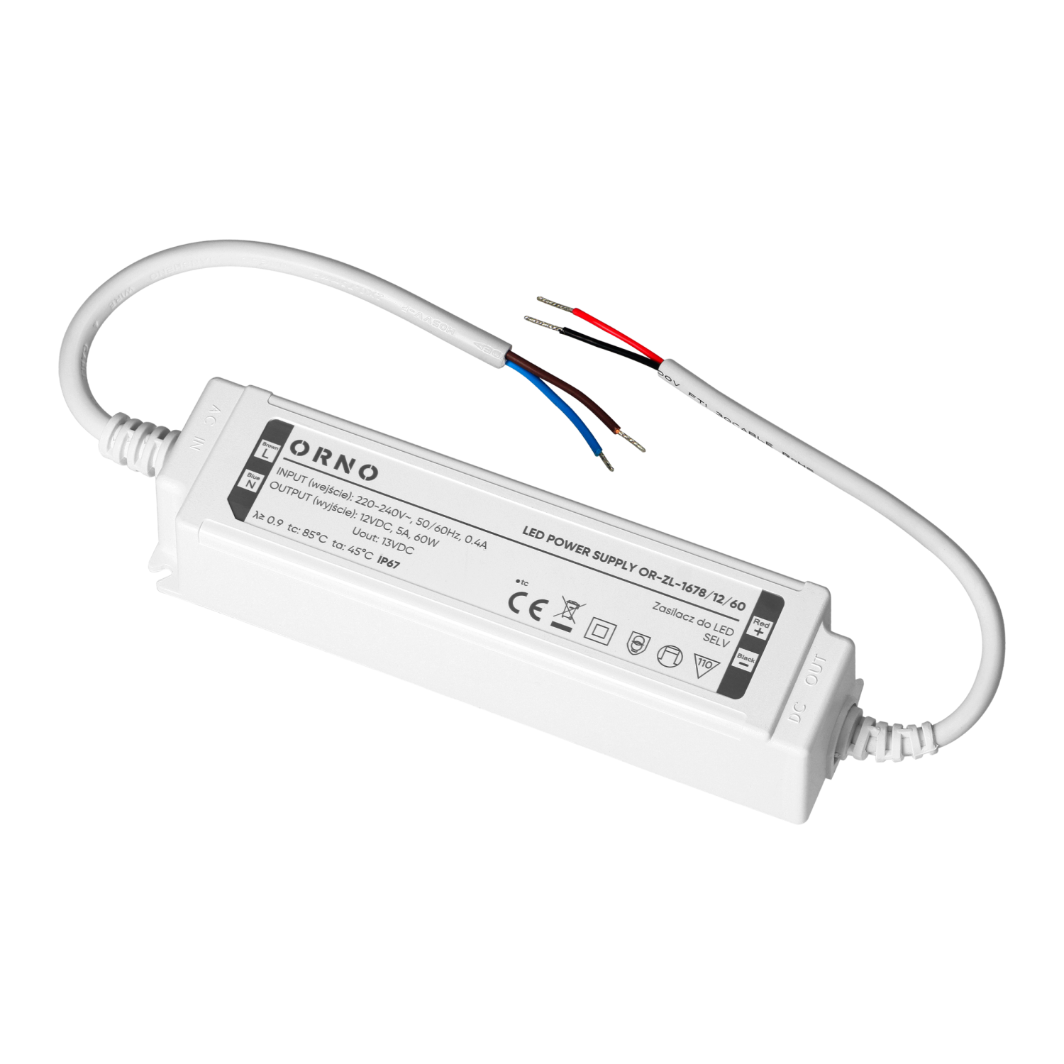 The unit operates within an input voltage range of 220-240V and provides a maximum output of 60W. Its airtight, waterproof plastic housing meets the IP67 protection class. High tightness of the housing effectively protects the power supply against water, dust and other external factors, which ensures long-term and reliable operation even in demanding environments, especially outdoors.
