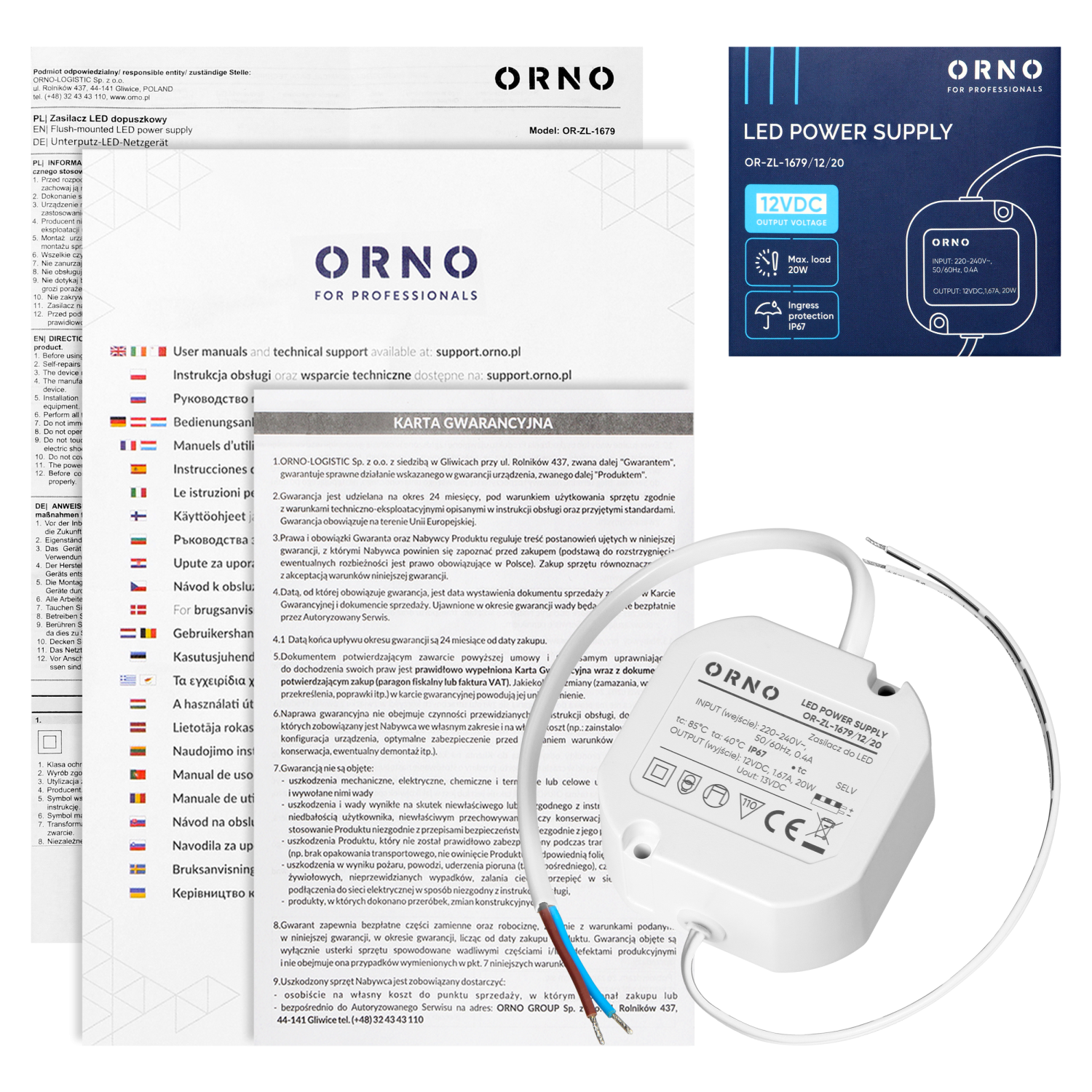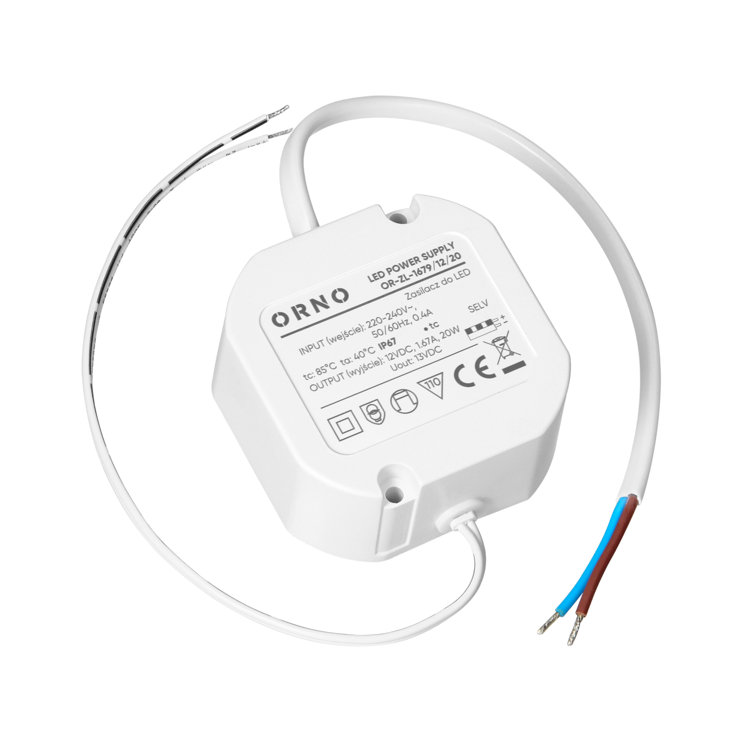 The unit operates within an input voltage range of 220-240V and provides a maximum output of 20W. Its airtight, waterproof plastic housing meets the IP67 protection class. High tightness of the housing effectively protects the power supply against water, dust and other external factors, which ensures long-term and reliable operation even in demanding environments, especially outdoors.
