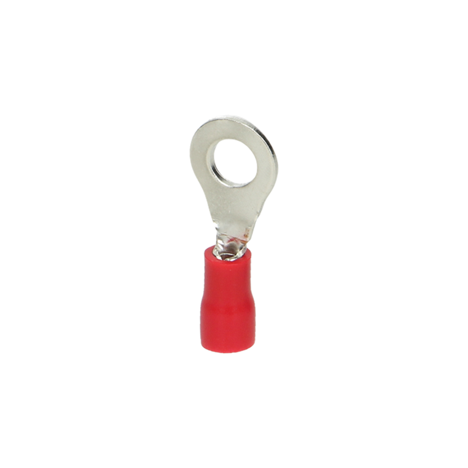 Insulated ring terminal that can be clenched on stranded cable ends to secure them in a neat and safe manner. Thanks to the ring, the cable can be fixed with a screw. This product is made of tin-plated copper. Our offer includes insulated terminals of many different max. section parameters and different screw ring diameters.