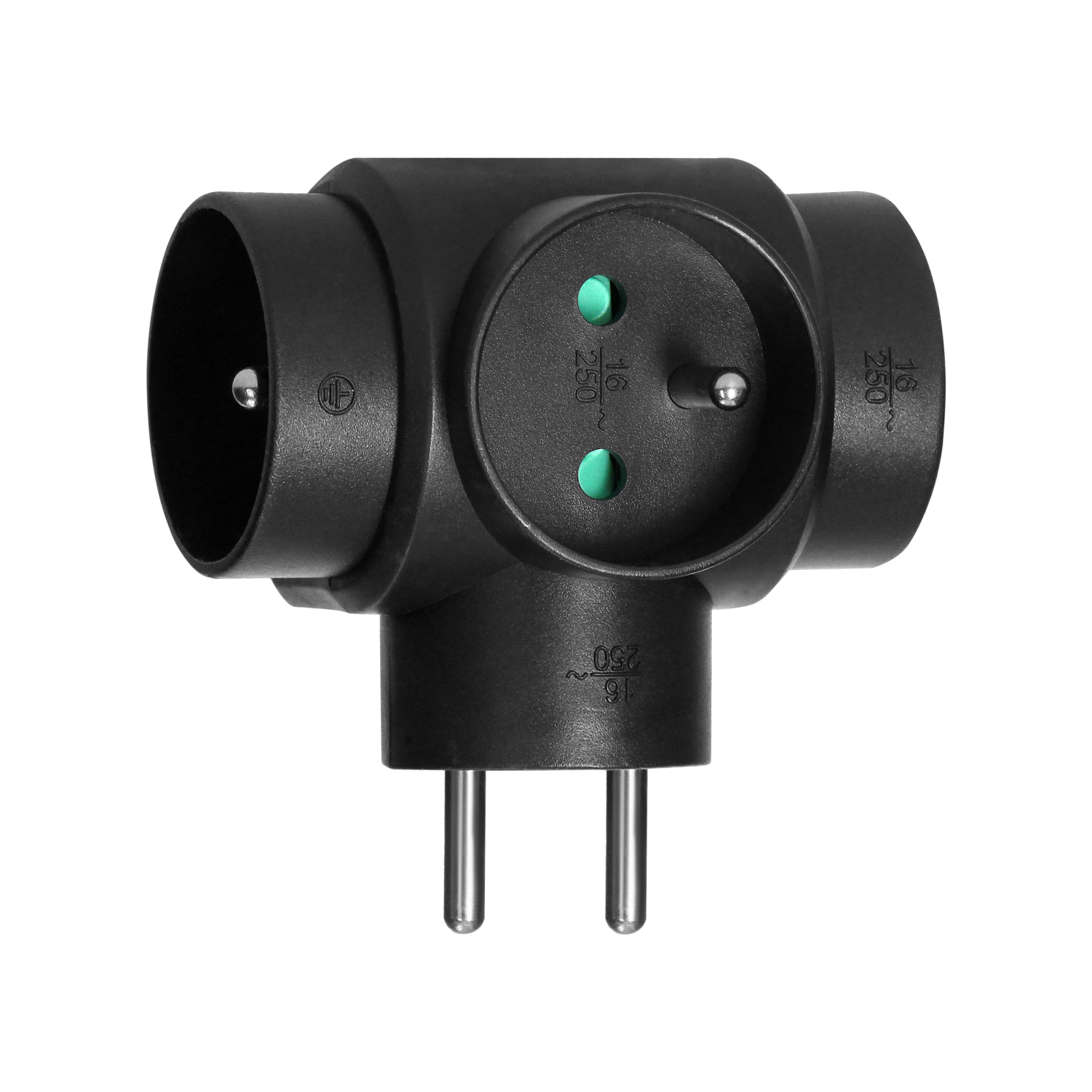 Triple power splitter with round, grounded sockets (E-type). It comes in handy whenever additional sockets are required. Black color.
