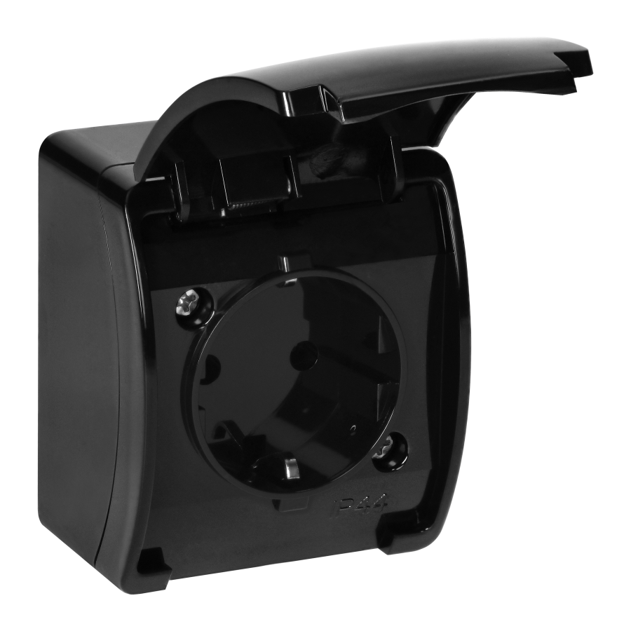 Gniazdo pojedyncze z uziemieniem typu F (Schuko), przeznaczone do montażu natynkowego. Produkt posiada praktyczną klapkę, która chroni wnętrze gniazda przez bezpośrednim dostępem pyłów i wody, dzięki czemu gniazdo może być również montowane w pomieszczeniach o podwyższonej wilgotności, takich jak kuchnia czy łazienka. Produkt wykonany jest z wysokogatunkowego tworzywa sztucznego i występuje w 4 kolorach: białym, czarnym, białym-dymionym lub szaro-grafitowym. Posiada klasę szczelności IP44, więc może być stosowany zarówno wewnątrz, jak i na zewnątrz.