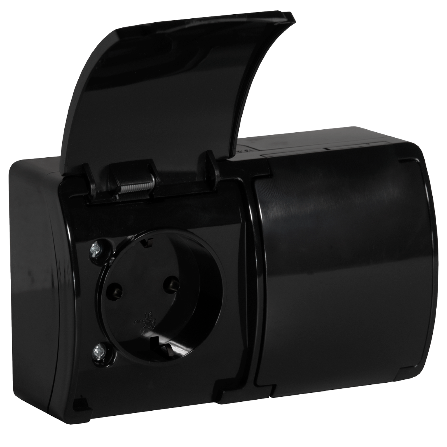 Gniazdo podwójne z uziemieniem typu F (Schuko), przeznaczone do montażu natynkowego. Produkt posiada praktyczne klapki, które chronią wnętrze gniazda przez bezpośrednim dostępem pyłów i wody, dzięki czemu gniazdo może być również montowane w pomieszczeniach o podwyższonej wilgotności, takich jak kuchnia czy łazienka. Produkt wykonany jest z wysokogatunkowego tworzywa sztucznego i występuje w 3 kolorach: białym, czarnym lub szaro-grafitowym. Posiada klasę szczelności IP44, więc może być stosowany zarówno wewnątrz, jak i na zewnątrz. 10 szt..