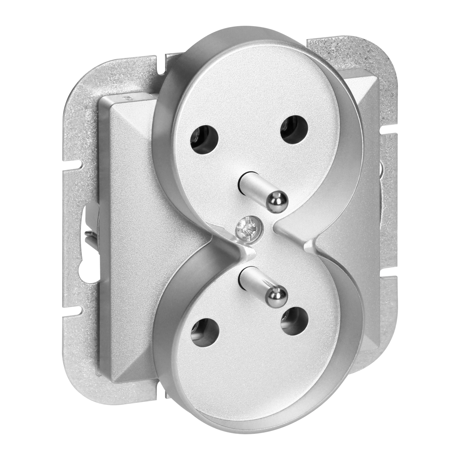 Podwójne gniazdo typu francuskiego do systemu ramkowego, podtynkowe 2x2P+Z. Należy stosować wewnątrz pomieszczeń (IP20).