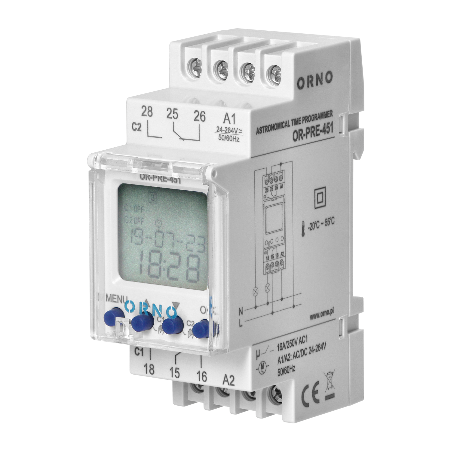 Wielofunkcyjny programator czasowy przydatny w każdym domu i firmie, przeznaczony do montażu na szynie DIN. Pozwala w prosty sposób zaoszczędzić energię elektryczną i ułatwić użytkowanie różnych urządzeń elektrycznych . Wbudowany zegar astronomiczny oblicza czas wschodu i zachodu słońca w ustalonym obszarze geograficznym i strefie czasowej. Programator włącza i wyłącza dopływ prądu w określonym przedziale czasowym, a 100 punktów przełączania umożliwiają dopasowanie ustawień do indywidualnych potrzeb. Rodzaje programów: tygodniowy, roczny i astronomiczny. Tryby działania: ręczny, automatyczny, wakacyjny, losowy. Automatyczne przełączanie czasu zimowego. Dzięki programowi astronomicznemu załączamy urządzenia wg wschodów i zachodów słońca ,a niezależny program czasowy pozwala na dodatkowe ustawienie przedziałów w których urzadzenie ma zostać załaczone, czyli możemy zdefiniować w ten sposób przerwę nocną. Urządzenie idealne do sterowania pracą oświetlenia, ogrzewacza wody, silników, pomp itp. Posiada wbudowaną baterię, która podtrzymuje ustawienia zegara w przypadku wyłączenia zasilania elektrycznego.